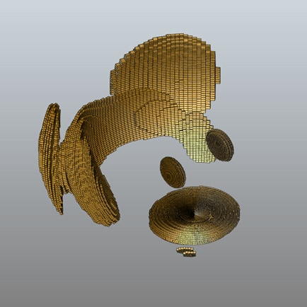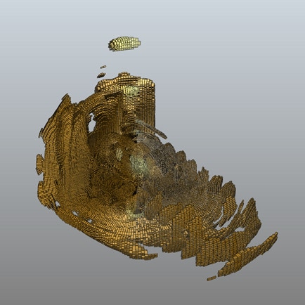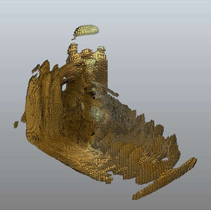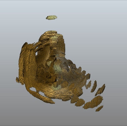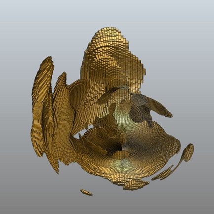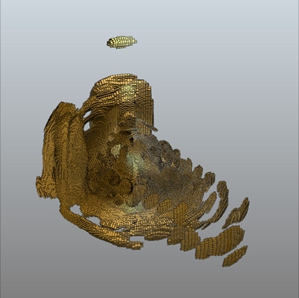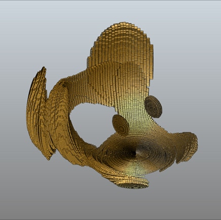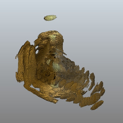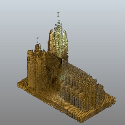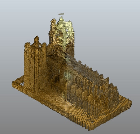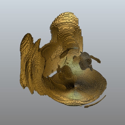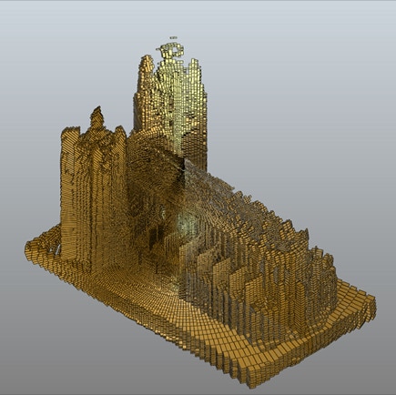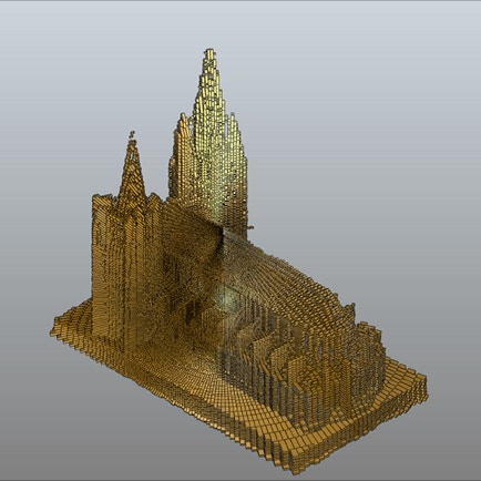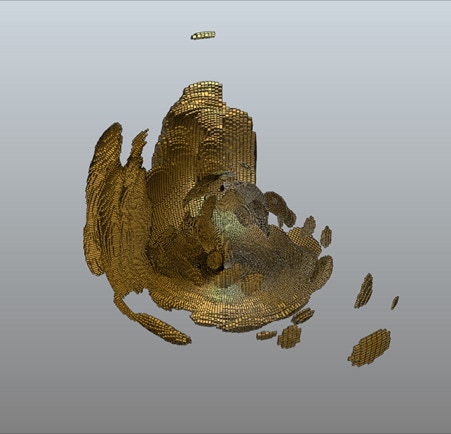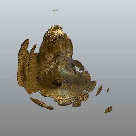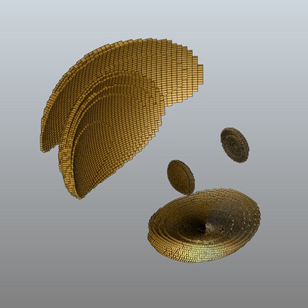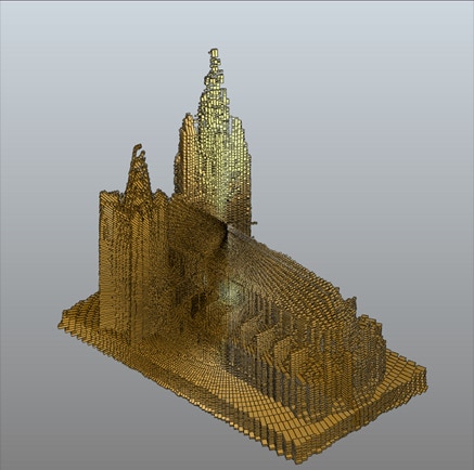Reconstitution de la cathédrale à basse résolution, en reconstituant progressivement les coquilles sphériques par adjonction d’harmoniques sphériques dont l’amplitude peut prendre deux valeurs : zéro (espace vide), un (fragment de matière). On voit littéralement la cathédrale naître du vide, par interférences constructives entre les différentes harmoniques.
