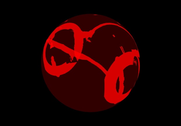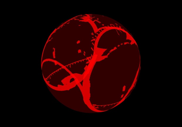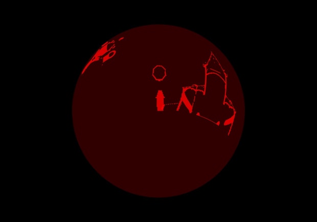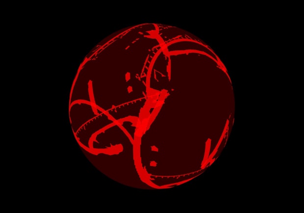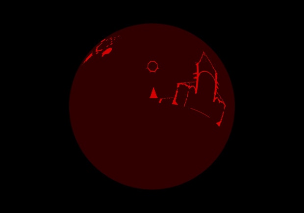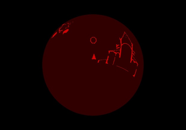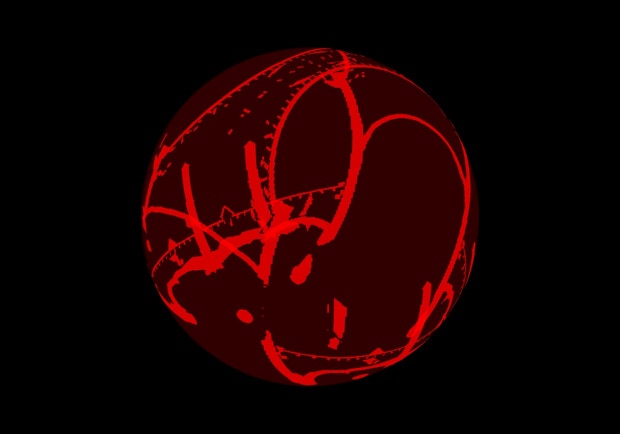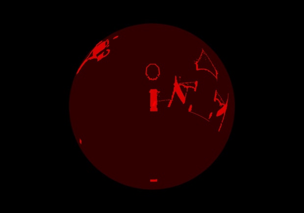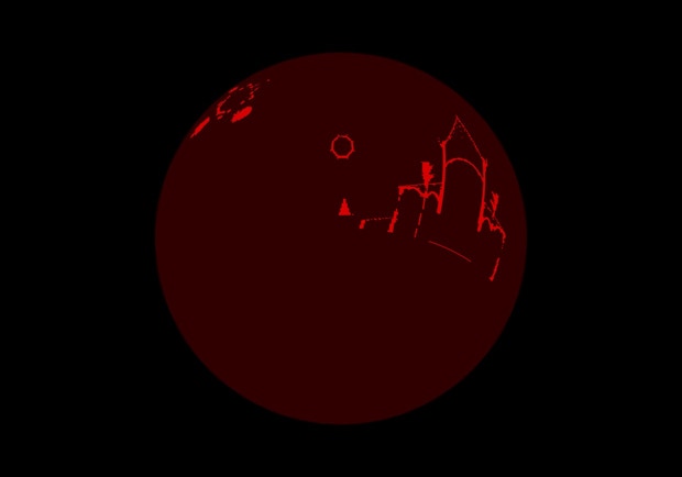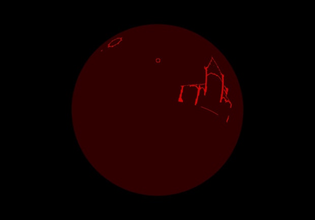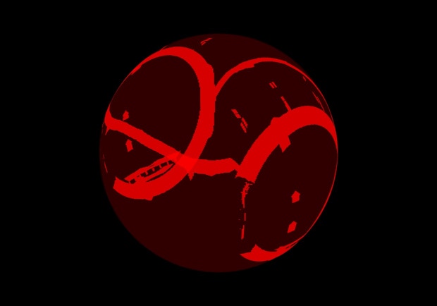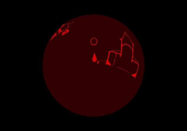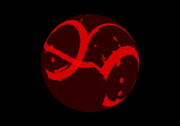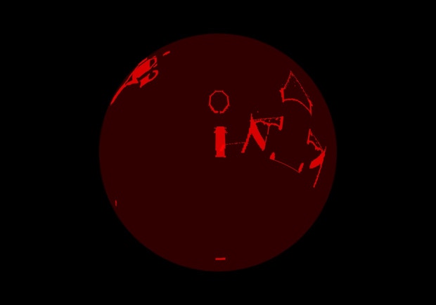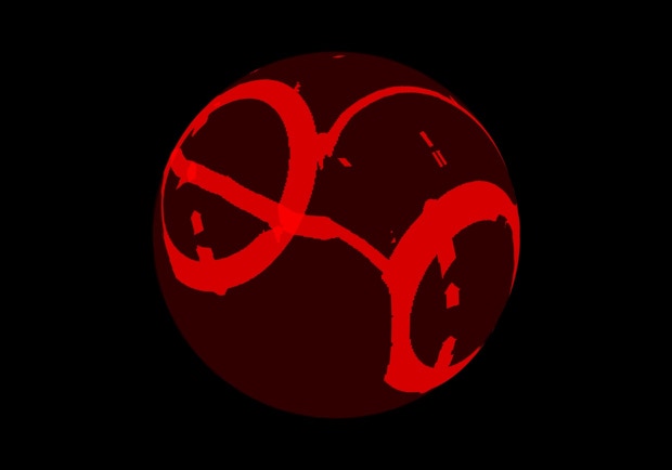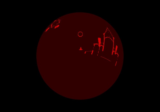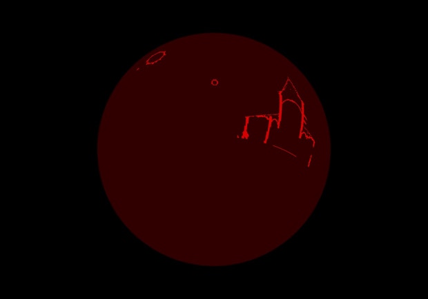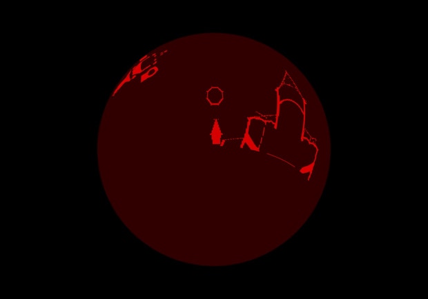 Motifs d’intersection apparaissant sur une sphère croissant progressivement depuis le centre géométrique de la cathédrale, jusqu’à englober complètement cette dernière. Le rayon des sphères est normalisé (toutes les sphères paraissent de taille identique) de façon à mieux voir l’évolution des motifs d’intersection à mesure qu’augmente le rayon de la sphère.